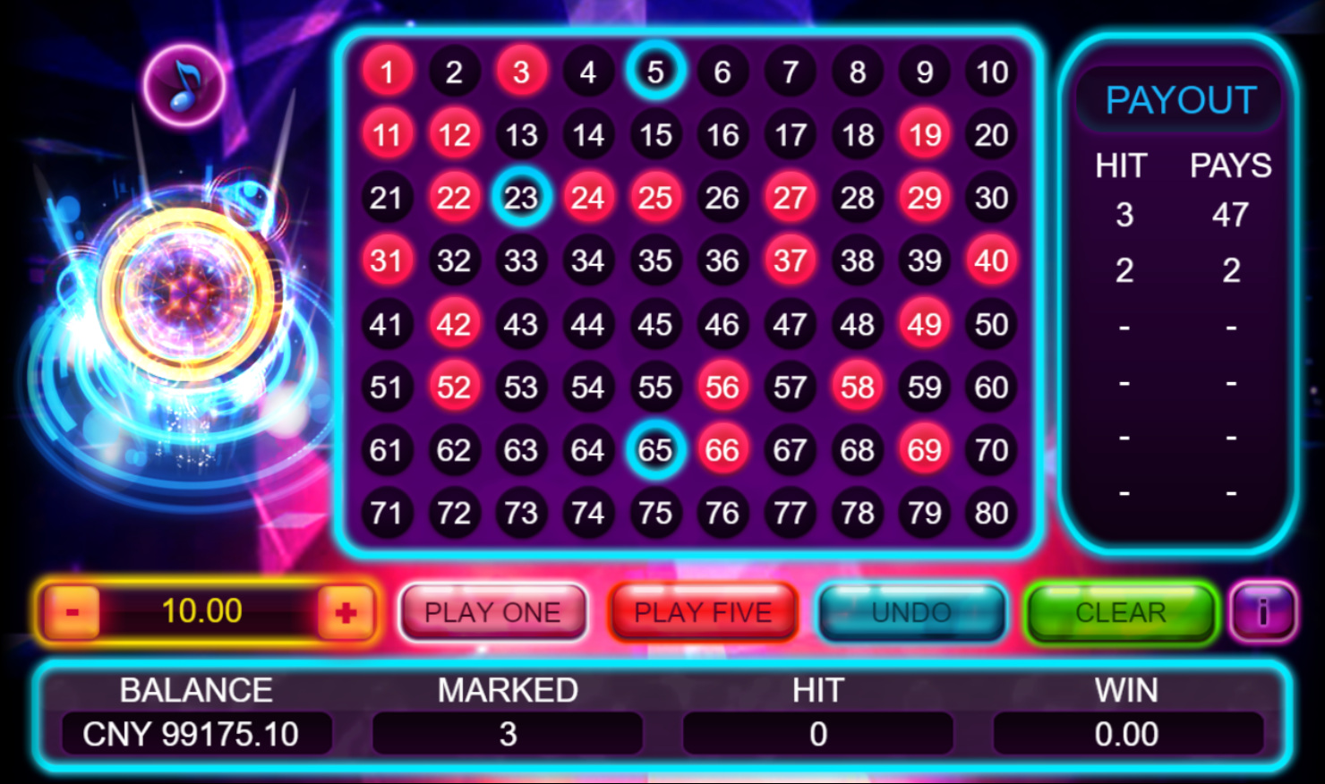 Компания Triple PG называет свою игру в кено Neon Keno. Это, пожалуй, самая быстрая игра в кено, которую я когда-либо видел. Вместо того чтобы вытаскивать 20 шаров из корзины, игра стреляет лазером по 20 числам на карточке. Однако математические вычисления остаются теми же.