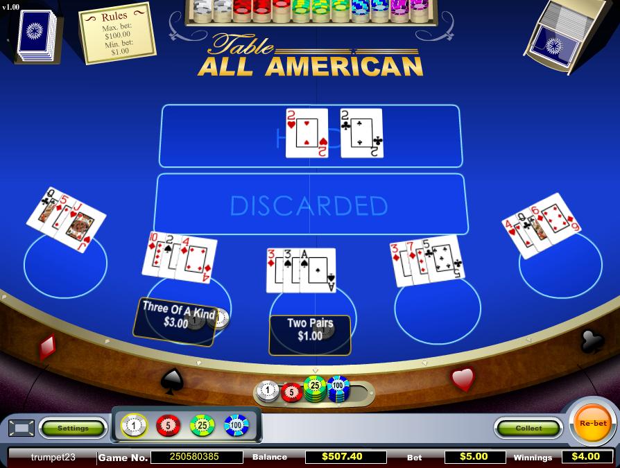 Это настольная версия видеопокера All American . Игрок может сделать от одной до пяти ставок. В Vista используется та же таблица выплат, что и в видеопокере, за исключением того, что за роял-флеш выплачивается 250 вместо 800 за каждую ставку. Это снижает преимущество казино с 96,27% до 95,12%.